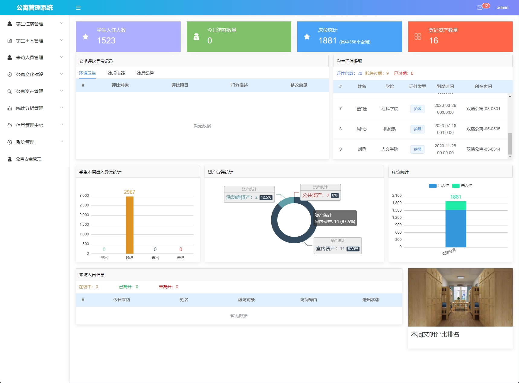 该项目于2020年9月于大学开学正式上线,主要负责学生宿舍管理、人脸识别以及体温测量的闸机通行,从而统计出学生的异常外出情况。一方面显著提升学生出入的通行效率,减少出入口值班人员数量;另一方面,统计学生异常出入情况,其中包括早出晚归,超时未出未归;该平台的应用场景除了应用于学生公寓的住宿,对各个园区、公共场所等人员出入流量密集的区域,都能明显赋予项目减人提效的积极作用。